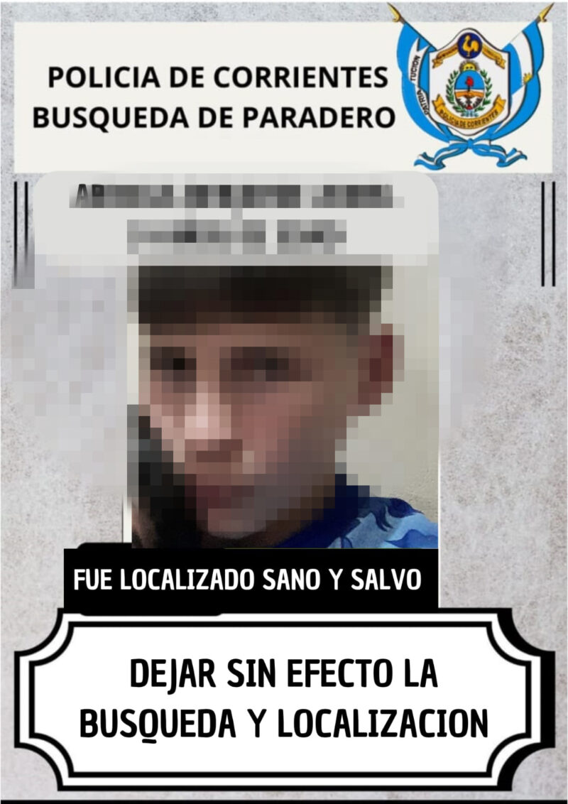 La Policía de Corrientes informó este sábado, el feliz desenlace de una búsqueda de paradero que había mantenido en vilo a la comunidad en las últimas horas. El menor A Benjamín Leonel, de 14 años de edad, fue localizado sano y salvo, dando por concluida la alerta emitida ayer por Comisaría Primera de la Mujer y el Menor de Capital.