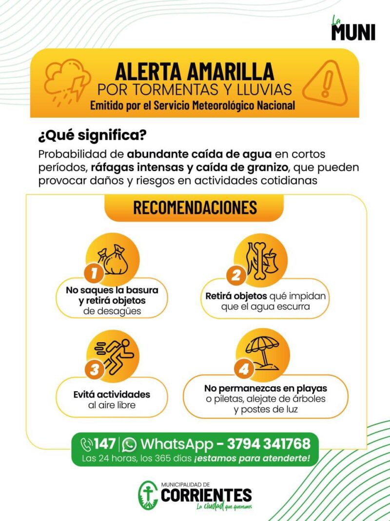 Desde la Municipalidad comunicaron a través de sus redes sociales que la ciudad continúa bajo alerta amarilla por tormentas y emitieron recomendaciones para evitar mayores inconvenientes, como no sacar la basura y evitar circular por zonas anegadas. “Es importante seguir las recomendaciones y, ante cualquier eventualidad, comunicarse con el 147”, remarcaron desde el área de Gestión de Riesgo.