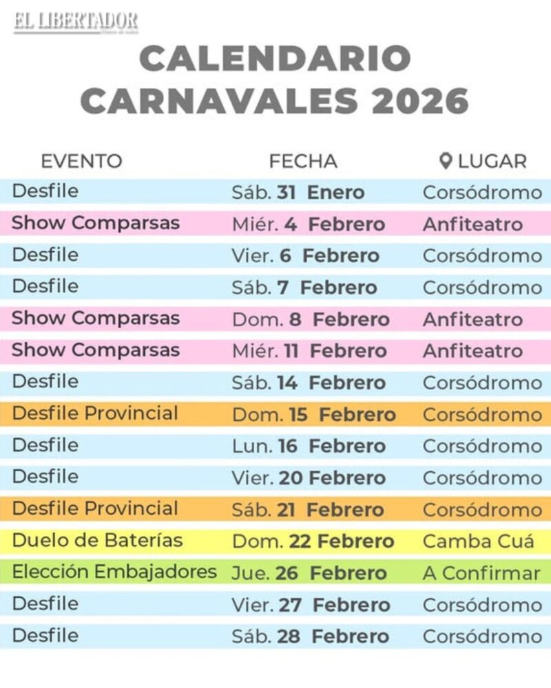 Por último, el organizador indicó que “el carnaval inicia el 31 de enero con el desfiele en el corsódromo y es un mes muy cargado, con muchas actividades del 31 de enero al 28 de febrero con los 3 shows de comparsas en el Anfiteatro, miércoles 4, miércoles 11 y domingo 8 de febrero, duelo de baterías en el Parque Cambá Cuá el 22 de febrero” y añadió que “también habrá elección de embajadores, carnaval provincial con comparsas de 8 ciudades de la provincia las campeonas del 2026 los días domingo 15 de febrero y sábado 21 de febrero”.