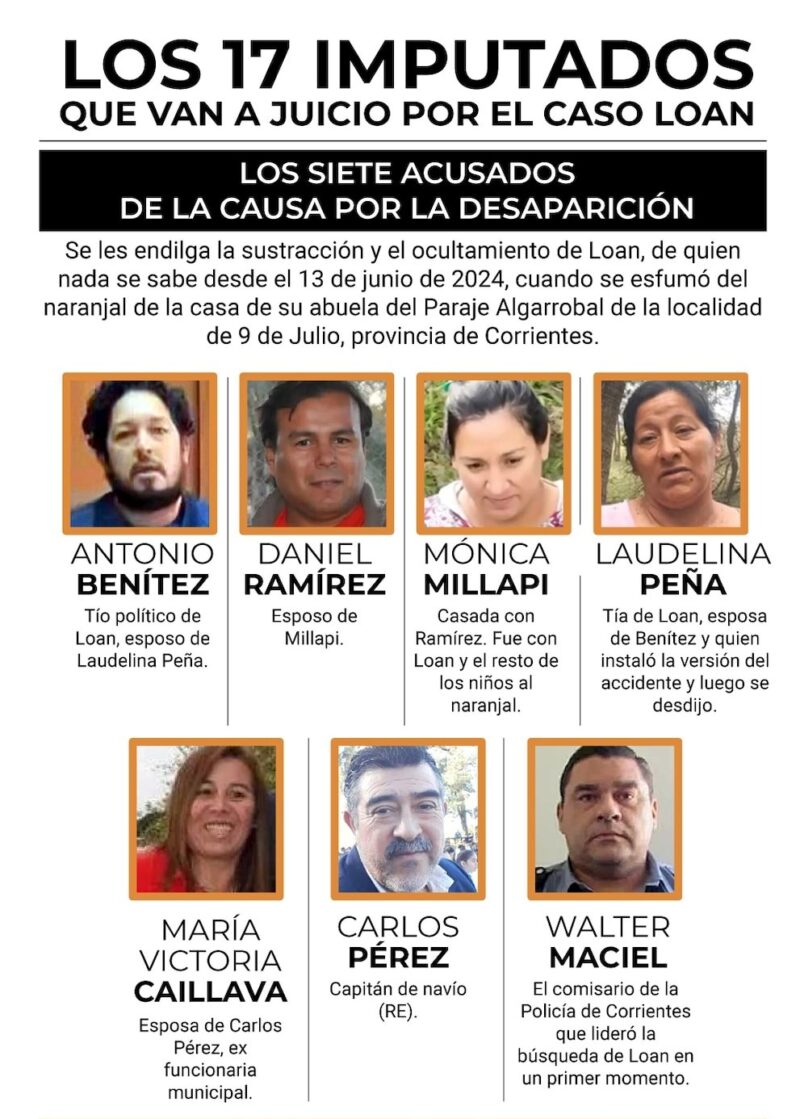 Los 10 imputados por la causa paralela son: Nicolás Gabriel Soria, alias “El Americano” o “El Yanqui”, Elizabeth Cutaia, Pablo Noguera, Leonardo Rubio, Alan Cañete, Delfina Taborda, Verónica Machuca Yuni, Valeria López, Pablo Núñez y Federico Rossi Colombo. Y se los acusa por haber retenido a los menores que estuvieron con Loan en el naranjal el día de su desaparición y por haber manipulado sus declaraciones para entorpecer la investigación, además de defraudar a la administración pública.