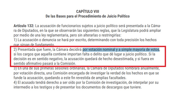 Conforme lo establecido en el artículo 132 de la Constitución provincial, en el capítulo sobre las bases para el procedimiento de juicio político, en cuyo inciso 2 se aclara que la Cámara decidirá por votación nominal y a simple mayoría de votos, el titular de Diputados, Pedro Cassani procedió en tal sentido.