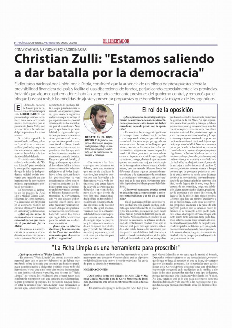 – En cuanto a la convocatoria de sesiones extraordinaria, obviamente que nosotros estamos dispuestos a debatir todo lo que haga falta y lo que pueda mejorar la vida de los argentinos, pero de igual manera seguimos reclamando que se incluya el presupuesto en estas, lo cual obviamente no fue escuchado por el oficialismo. Nos parece que hace la previsibilidad, la rigurosidad que tienen que tener las cuentas de un país como el nuestro, ya que luego se pueden usar esos fondos discrecionalmente y obviamente que las provincias son las que más sufren las consecuencias teniendo en cuenta la política. Un poco por así decirlo, el látigo y chequera que tiene el Presidente Mili a la hora de cerrar acuerdos, lo hemos reflejado en el Poder Legislativo sobre todo, en donde los gobernadores se ven coaccionados sobre este redireccionamiento de los fondos para tratar de subsistir en las provincias, que tanto falta nos hacen esa redistribución. Y, obviamente, uno ve que algunos gobernadores ceden hasta ante estas presiones y cuasi extorsiones. Así que de igual manera nosotros estaremos debatiendo todos los temas que hagan falta y estaremos para dar rebate en las diferentes temáticas.