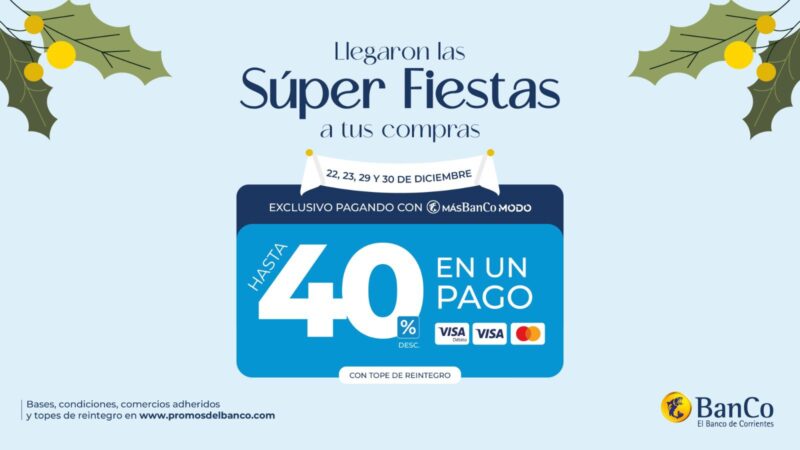 El Banco de Corrientes puso en marcha desde hoy la promoción “Súper Fiestas”, una de las iniciativas comerciales más relevantes del calendario de fin de año en la provincia, orientada a facilitar las compras navideñas mediante importantes beneficios económicos. La acción se desarrolla en supermercados, carnicerías, bodegas y comercios afines adheridos, con alcance en todo el territorio correntino, y busca acompañar el aumento del consumo propio de esta etapa, caracterizada por un mayor movimiento comercial y familiar.