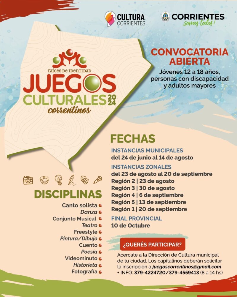El Instituto de Cultura abrió formalmente el período de inscripción en toda la provincia a los Juegos Culturales Correntinos, destinado a jóvenes entre 12 a 18 años y adultos mayores, que competirán en las disciplinas de canto, danza, conjunto musical, teatro, dibujo/pintura, cuento, poesía, fotografía, historieta, videominuto y freestyle.