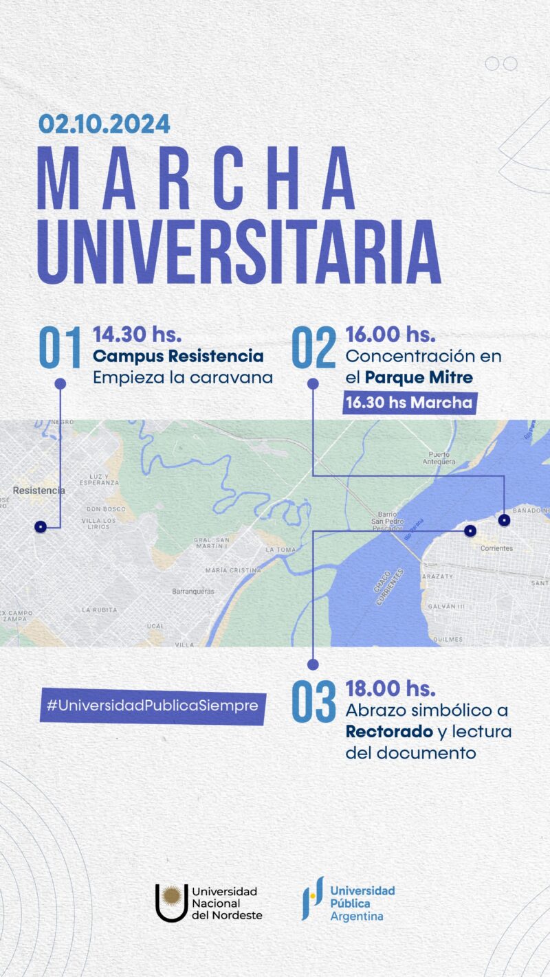 El punto de partida en Resistencia será el Campus de la Unne, ubicado en avenida Las Heras 727. La convocatoria será a las 14.30, y desde ahí saldrá una caravana que se dirigirá hacia Corrientes.