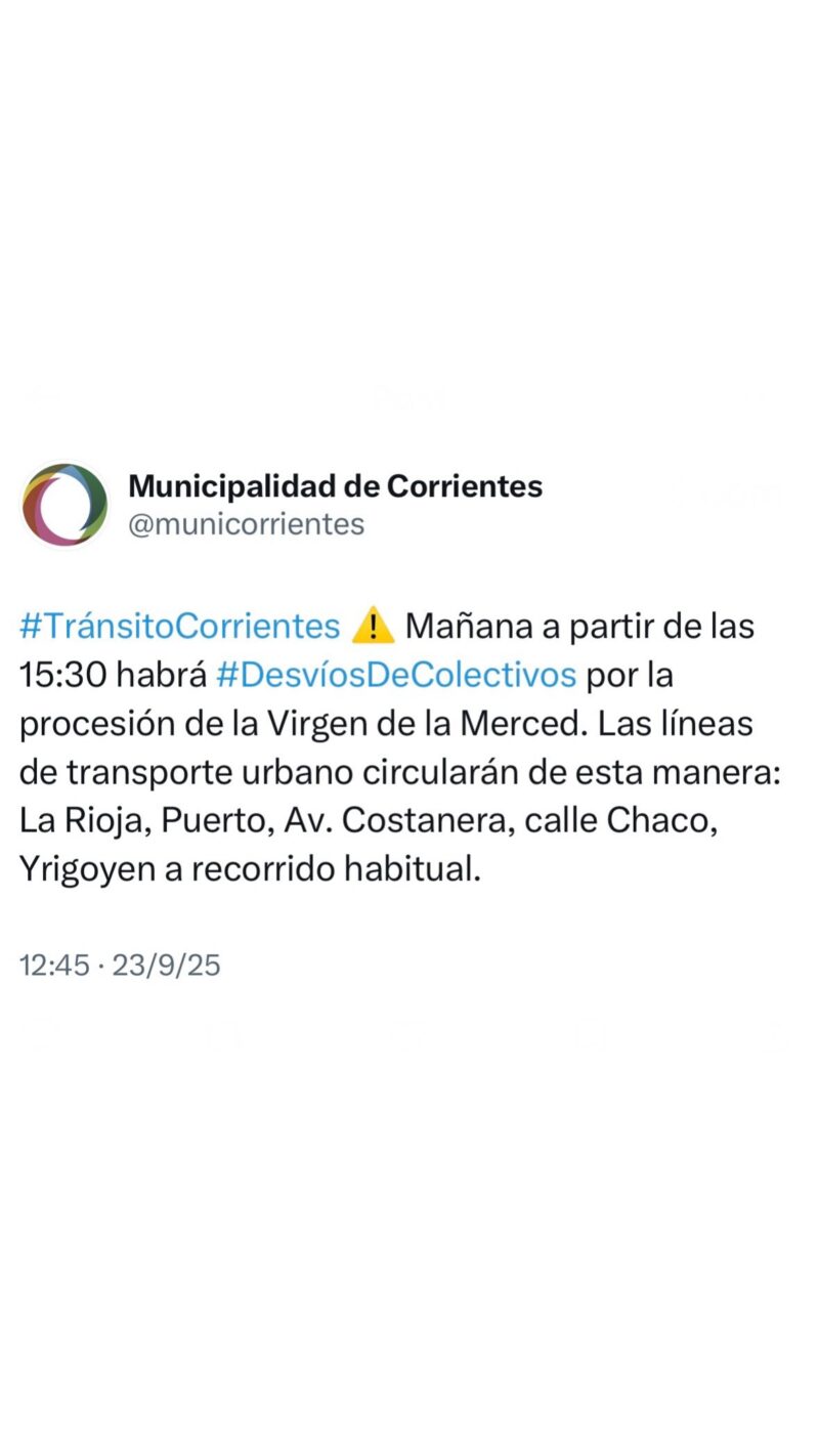 Desde la Municipalidad de la Ciudad de Corrientes advirtieron a todos los usuarios sobre los desvíos del recorrido del transporte urbano a causa de la procesión por el día de Nuestra Señora de la Merced.