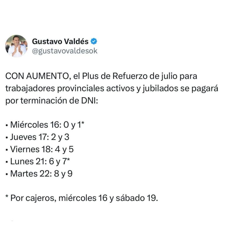 A través de sus redes sociales, @gustavovaldesok, el gobernador Gustavo Valdés anunció el cronograma de pago del Plus de Refuerzo de julio que será con aumento del 100%, ascendiendo a $100.000 por agente de la administración pública provincial, activos, jubilados y pensionados. La liquidación del beneficio comienza este miércoles 16 y se extiende hasta el martes 22.