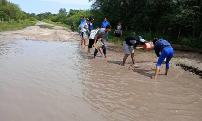 Un grupo de alumnos y docentes de la Extensión Áulica de la Escuela Nº 527 del paraje Rincón de Sarandí, en el departamento de Esquina, se encargaron de retirar el agua de un camino de tierra donde se formaron grandes charcos de agua debido a las lluvias.