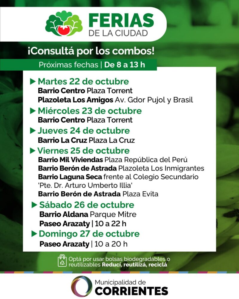 Mientras, el miércoles, los feriantes se trasladarán a la plaza Torrent. El jueves, los stands estarán en plaza La Cruz, por calle Salta, en el barrio del mismo nombre. Y como todos los viernes, las Ferias se instalarán, en simultáneo, en la plaza República del Perú de las Mil Viviendas; en la plazoleta Los Inmigrantes del barrio Berón de Astrada; en el predio de Larrea al 3400 (frente al Colegio Illia) del barrio Laguna Seca; y en la plaza Evita (Sarmiento y Maipú) del barrio Berón de Astrada.