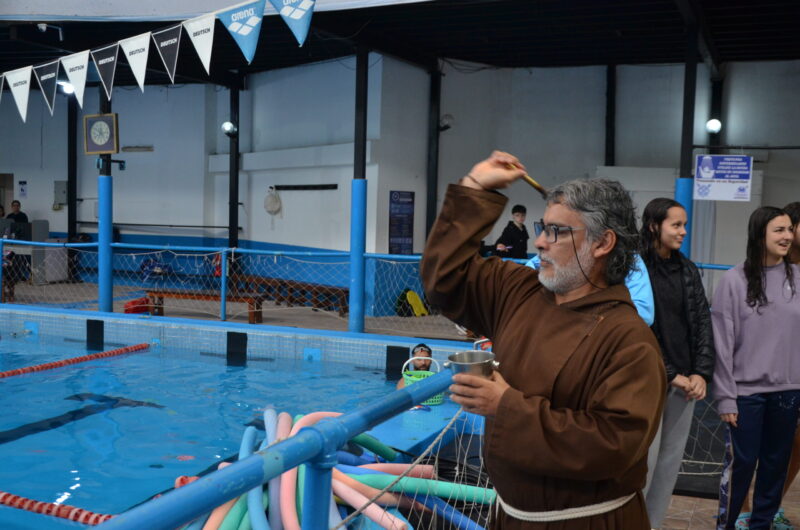 Luego, se trasladaron hacia el natatorio climatizado de la institución, el cual reabrió sus puertas luego y ya se encuentra en pleno funcionamiento desde el pasado 1 de noviembre. Nuevamente el padre tomó la posta y bendijo las instalaciones, el agua de la pileta y a los nadadores que se encontraban allí.