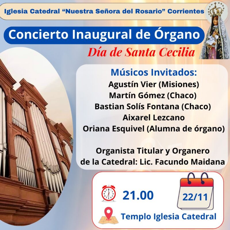 En honor al día de Santa Cecilia, en la Iglesia Catedral Nuestra Señora del Rosario Corrientes mañana a partir de las 21 se llevará a cabo un Concierto Inaugural de Órgano.