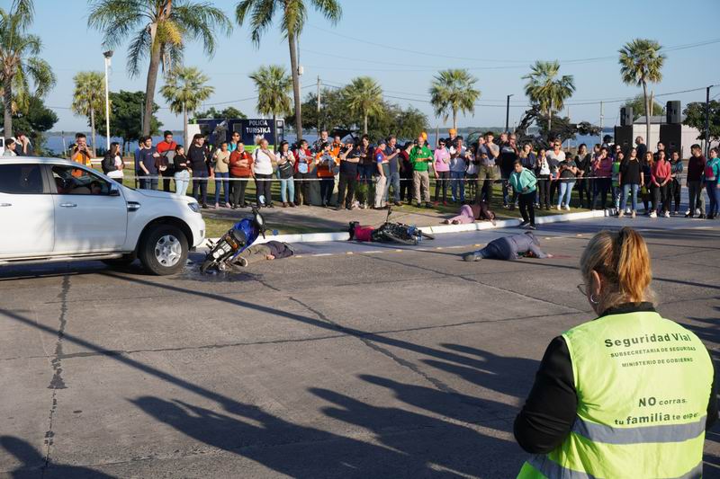 La escena se trató del choque de una camioneta contra una moto y también un ciclista, donde a medida que se desarrolla la actividad se fue explicando quiénes son los actores que intervienen cuando se produce un siniestro vial en cualquier punto de la provincia de Corrientes.