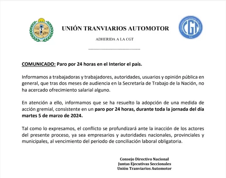 Por falta de un acuerdo paritario con las cámaras empresariales, la Unión Tranviarios Automotor (UTA) anunció un nuevo paro de colectivos para todo el Interior del país. La medida de fuerza empieza a las 00 de este martes y va a durar 24 horas.