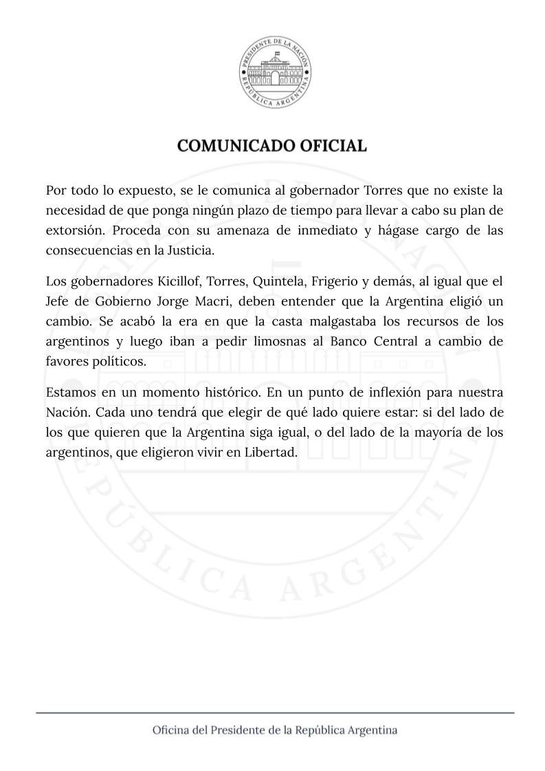 También hace minutos, la Oficina del Presidente publicó un comunicado en el que le responde al gobernador de Chubut y advierte al resto de los mandatarios provinciales que lo apoyaron.