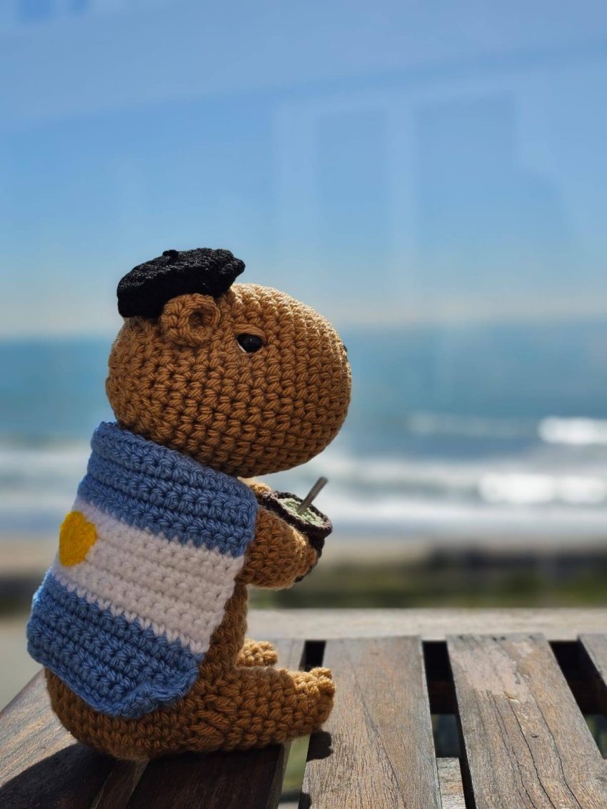 Se trata de la figura de un carpincho tejido en hilo, con un poncho con los colores de la bandera argentina y una simpática boina. Este tipo de artesanías se conoce como “amirigumi” y si bien su origen es japonés («ami» significa «tejer» y «nuigurumi» que significa «muñeco»), llegó para quedarse.