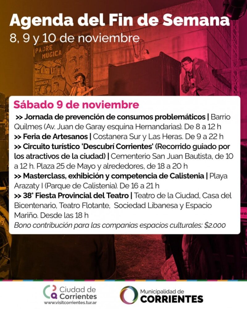 Como cada fin de semana, la Municipalidad de la ciudad de Corrientes pone a disposición de vecinos y visitantes una variada agenda de espectáculos para grandes y chicos. En esta oportunidad, la oferta incluye obras de teatro, calistenia y recorridos guiados por lugares emblemáticos de la ciudad, entre muchos otros.