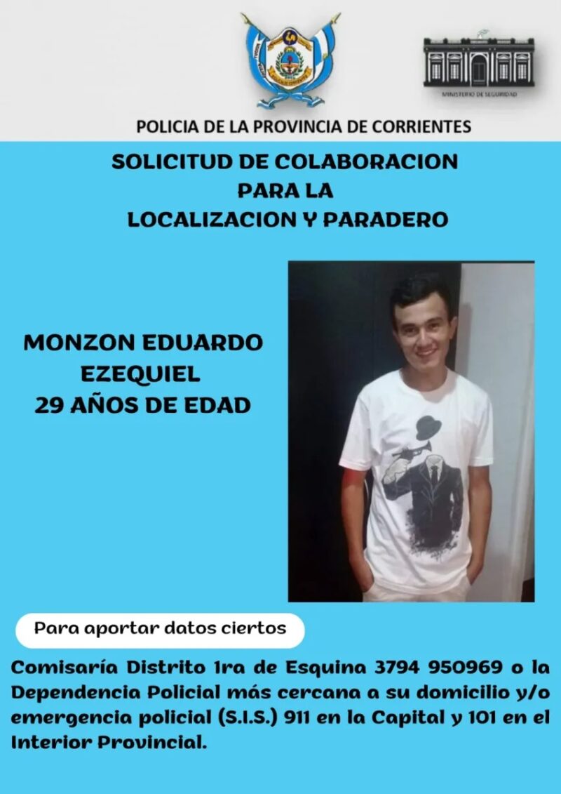 Se trata de Eduardo Ezequiel Monzón, de 29 años, quien desapareció en la madrugada del 5 de enero. La Policía de Corrientes, junto con fuerzas de apoyo, ha incrementado los esfuerzos de rastrillaje en un intento por dar con su paradero.