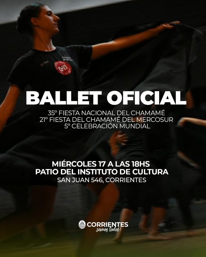 El Gobierno de Corrientes, a través del Instituto de Cultura, convoca a bailarines y bailarinas a participar de la audición para conformar el Ballet Oficial de la 35ª Fiesta Nacional del Chamamé, 21ª Fiesta del Chamamé del MERCOSUR y 5ª Celebración Mundial. La instancia de selección se llevará a cabo este miércoles 17 de diciembre, a partir de las 18, en el patio del Instituto de Cultura, ubicado en San Juan 546, en la ciudad de Corrientes.