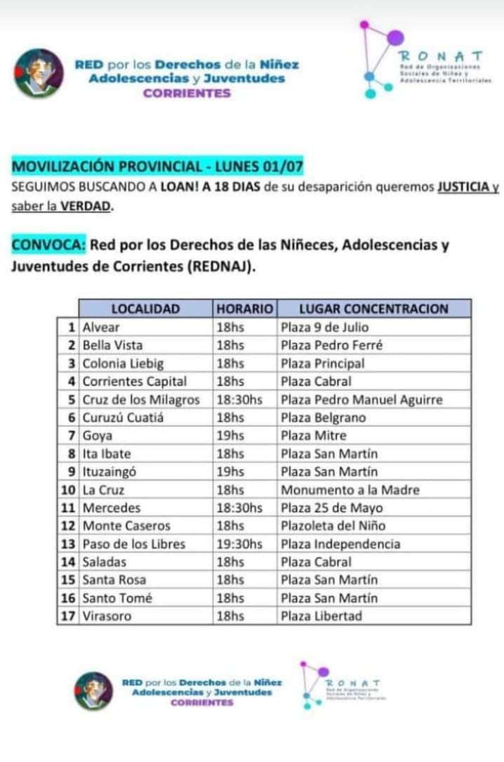 La Red por los Derechos de las Niñas, Adolescentes y Juventudes (Rednaj) de Corrientes convoca este lunes a una movilización provincial para exigir que se esclarezca qué pasó con Loan, a 18 días de su desaparición.