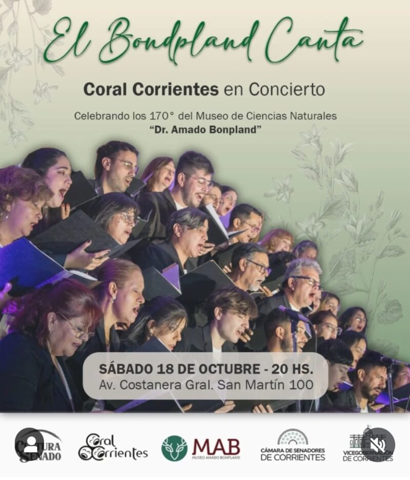 Hoy, sábado 18 de octubre, a las 20, el Museo de Ciencias Naturales “Dr Amado Bonpland” será escenario de un concierto especial a cargo de Coral Corrientes, en el marco de la celebración por los 170 años de la fundación del museo.