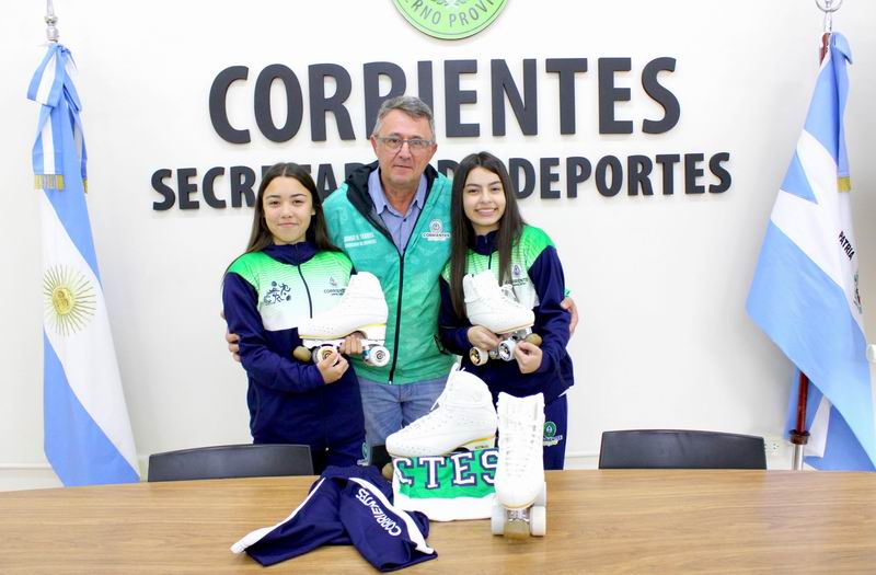 En representación del gobernador Gustavo Valdés, el secretario de Deportes de la Provincia, Jorge Terrile, entregó dos pares de patines e indumentarias a las atletas Ximena Altamirano de Capital y Malena Benítez de Gobernador Virasoro.