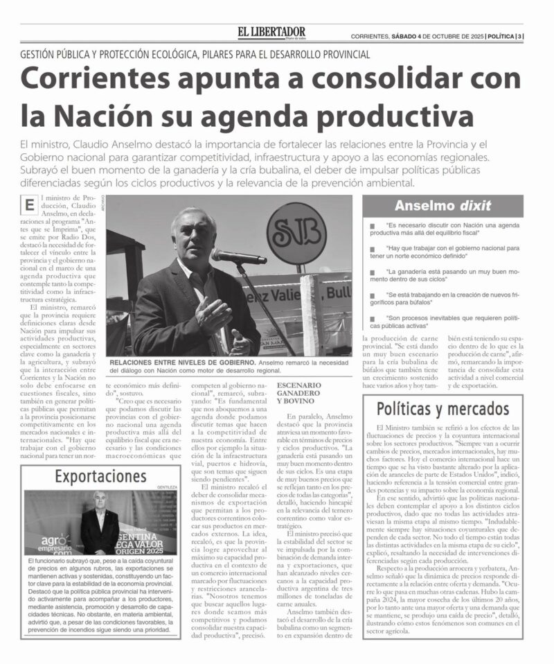 El ministro, remarcó que la provincia requiere definiciones claras desde Nación para impulsar sus actividades productivas, especialmente en sectores clave como la ganadería y la agricultura, y subrayó que la interacción entre Corrientes y la Nación no solo debe enfocarse en cuestiones fiscales, sino también en generar políticas públicas que permitan a la provincia posicionarse competitivamente en los mercados nacionales e internacionales. «Hay que trabajar con el gobierno nacional para tener un norte económico más definido», sostuvo.