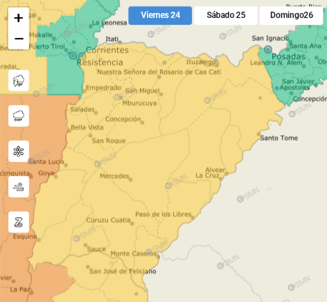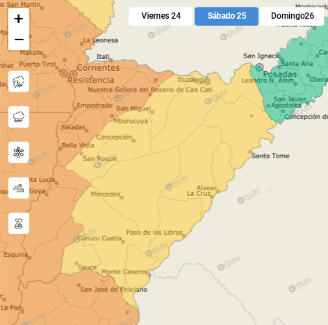 Las condiciones del tiempo podrían empeorar significativamente durante el sábado, especialmente para las ciudades y localidades ubicadas en la costa del Paraná. Esta zona ha sido elevada a un nivel de Alerta Naranja, el cual incluye a la Capital, San Cosme, San Luis del Palmar, Itatí, Berón de Astrada, Empedrado, General Paz, Mburucuyá, Saladas, Bella Vista, Lavalle, Goya y Esquina.