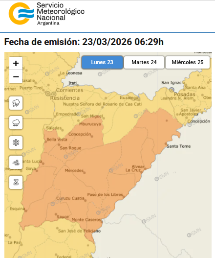 La jornada de este lunes, en pleno feriado puente turístico, se presenta con condiciones críticas para la provincia de Corrientes. El Servicio Meteorológico Nacional (SMN) emitió una doble advertencia que abarca la totalidad del territorio provincial, elevando el nivel a alerta naranja en gran parte de la región y manteniendo el amarilla hacia el norte.