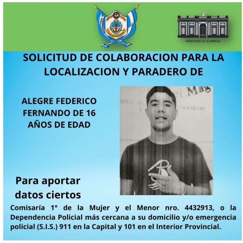 Federico Fernando Alegre (16) mide aproximadamente 1,75 metros, tiene tez morena, ojos negros, cabello negro corto y es de contextura delgada. Al momento de su desaparición, vestía bermudas de color negro, remera de mangas cortas gris con dibujos y calzaba crocs de color negro.