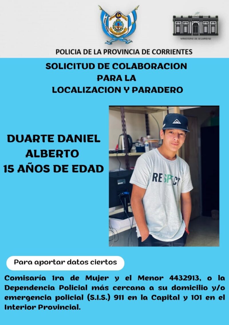 Daniel Alberto Duarte (15), mide 1,60 de estatura aproximadamente, es de tez trigueña, tiene ojos marrones, cabello corto y es de contextura delgada. No se difundió en este caso la ropa que llevaba puesta al momento de su fuga.