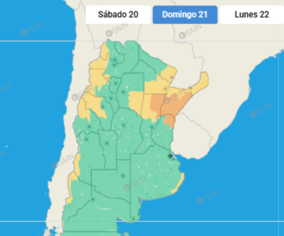 Respecto a la alerta amarilla, resaltaron que se espera “tormentas de variada intensidad, algunas localmente fuertes. Las mismas podrían estar acompañadas por abundantes lluvias, actividad eléctrica frecuente, granizo y ráfagas de hasta 70 km/h”.