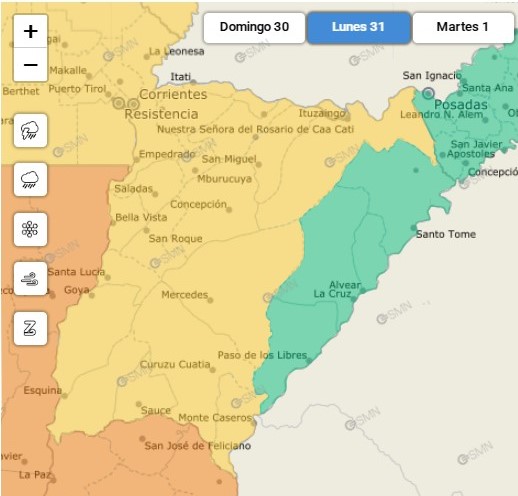 Además el Servicio Meteorológico Nacional, emitió una alerta amarilla para este lunes 31 en Corrientes. Se esperan lluvias y tormentas fuertes, que podrían estar acompañadas de ráfagas intensas, actividad eléctrica, caída de granizo y abundante caída de agua en cortos períodos. Las ráfagas podrán superar los 70 km/h, según advirtió el organismo.