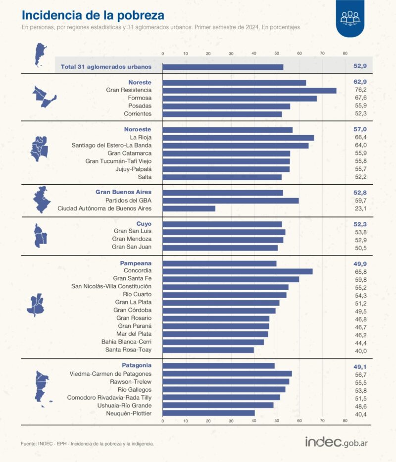 No obstante, a nivel país, la pobreza subió al 52,9% alcanzando a 24,9 millones de personas. Respecto a las regiones, se registró de forma escalonada al NEA (62,9%); NOA (57%); Gran Buenos Aires (52,8%); Cuyo (52,3%); Pampeana (49,9%); y Patagonia (49,9%).