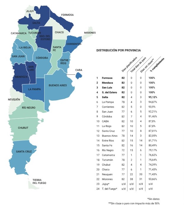 En tanto que Misiones, en donde hasta mitad de año solo habían tenido 44 días de clase normales de los 82 planificados, alcanzando 38 días de paro; Neuquén donde hubo 22 días de paro y Santa Fe con 16.