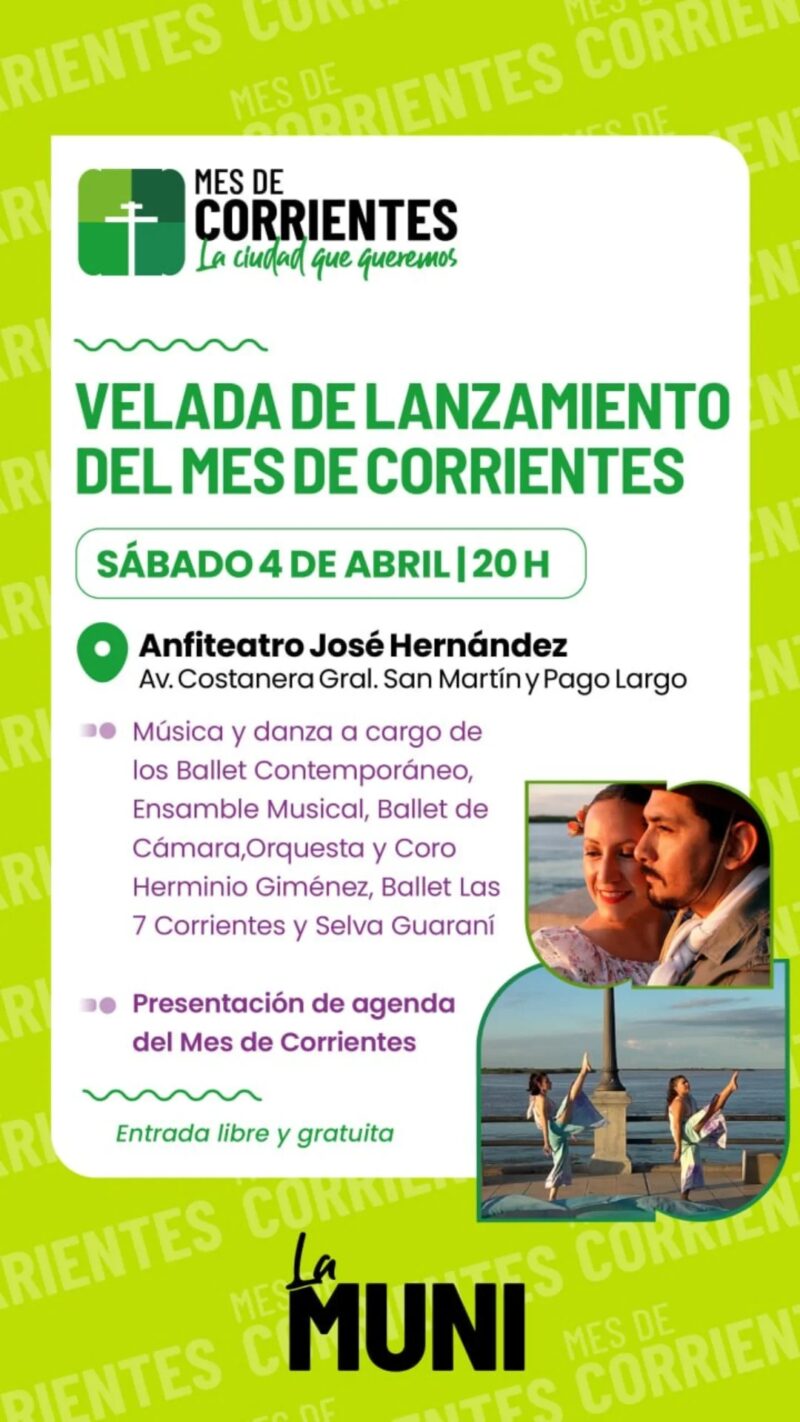 La capital correntina se viste de gala para celebrar un nuevo aniversario de su fundación. Este sábado 4 de abril, a partir de las 20, se llevará a cabo la Velada de Lanzamiento del Mes de Corrientes, un evento que promete reunir a las familias y turistas en uno de los puntos más emblemáticos de la ciudad: el Anfiteatro José Hernández, ubicado en la intersección de Av. Costanera General San Martín y Pago Largo.