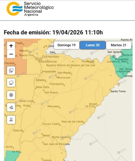 Tal como lo habíamos anticipado en EL LIBERTADOR, el escenario meteorológico para Corrientes se presenta complejo para el atardecer de este domingo 19. El Servicio Meteorológico Nacional (SMN), ratificó un escenario de inestabilidad y el inicio de precipitaciones en la capital y alrededores. Además endureció su reporte para mañana lunes: rige una alerta amarilla por tormentas que abarca a la totalidad del territorio provincial.