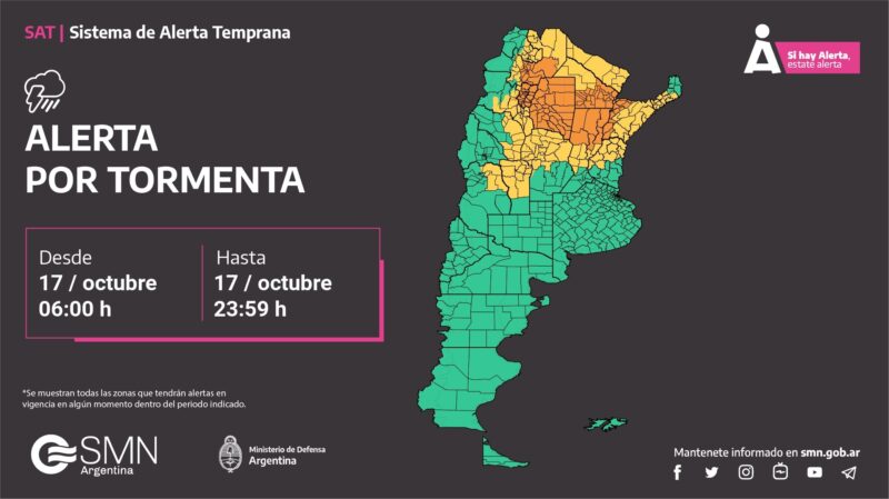 “El área será afectada por tormentas localmente fuertes o severas. Las mismas podrán estar acompañadas por ráfagas intensas superiores a 90 km/h, importante actividad eléctrica, caída de granizo de diversos tamaños, y abundante caída de agua en cortos períodos”, indica el SMN.