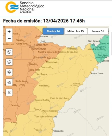 Para el resto de las localidades correntinas, el nivel de alerta es amarillo. Si bien el fenómeno se prevé con una intensidad menor que en el sector naranja, no deja de ser una situación de cuidado.
