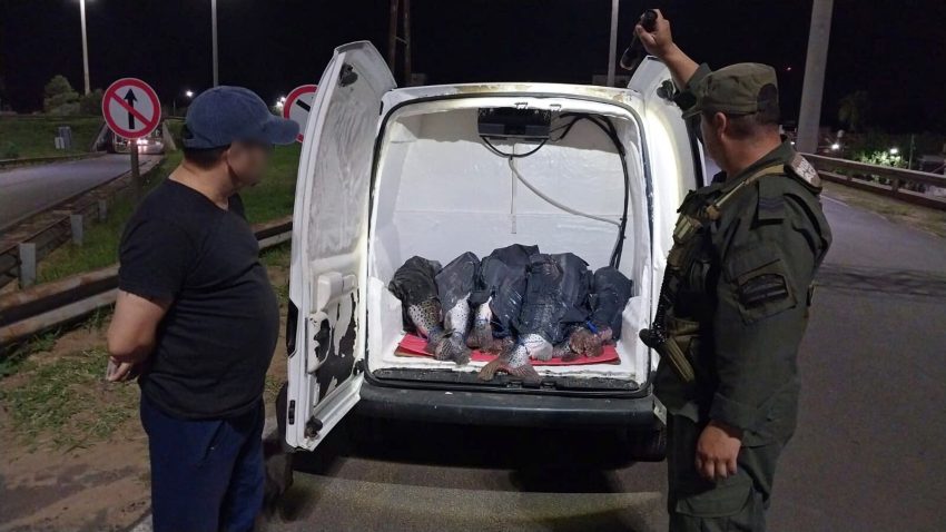 En un segundo procedimiento, personal de la Sección de Seguridad Vial “Puente General Belgrano” detuvo la marcha de un vehículo utilitario con habilitación para el transporte de sustancias alimenticias. Producto del control físico del mismo, los gendarmes corroboraron que en el compartimiento de carga se transportaban doce peces dentro de bolsas plásticas, los cuales carecían de cadena de frío, no encontrándose aptos para el consumo humano.