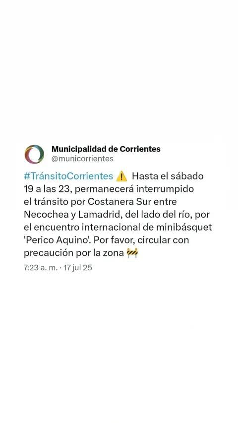 La Municipalidad de Corrientes a través de sus redes sociales (@municorrientes), anunció la interrupción del tránsito en una de las bandas de la Costanera Sur, durante tres días, por un evento deportivo.