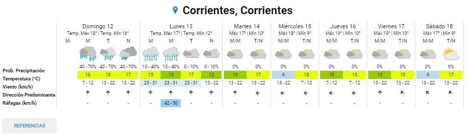 El pronóstico extendido del organismo nacional indica que la ciudad de Corrientes y sus alrededores estarán pasados por agua este domingo, en forma de lluvias, lloviznas y chaparrones. La temperatura alcanzará los 18 grados.