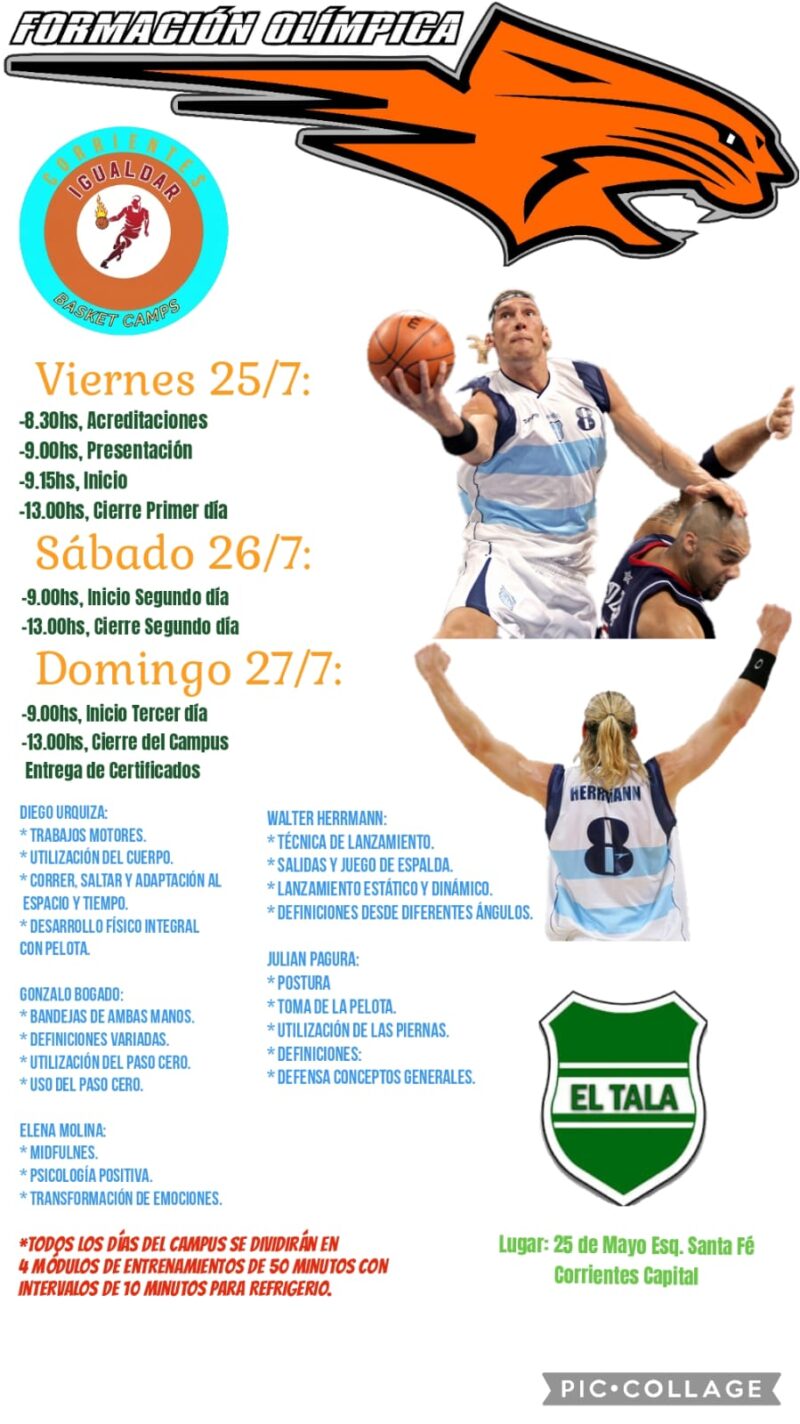 Este fin de semana, viernes 25, sábado 26 y domingo 27 de julio, el Club Atlético El Tala llevará adelante un Campus de Tecnificación y Perfeccionamiento, que contará con la presencia y participación del ex basquetbolista «Generación Dorada», ex NBA y EuroLiga, además de tener una extensa y exitosa performance en la Liga Nacional de Básquet (LNB), Walter Herrmann. El lugar elegido serán las instalaciones ubicadas en 25 de Mayo, esquina Santa Fe, estadio «El Coliseo Verde» de la ciudad de Corrientes.