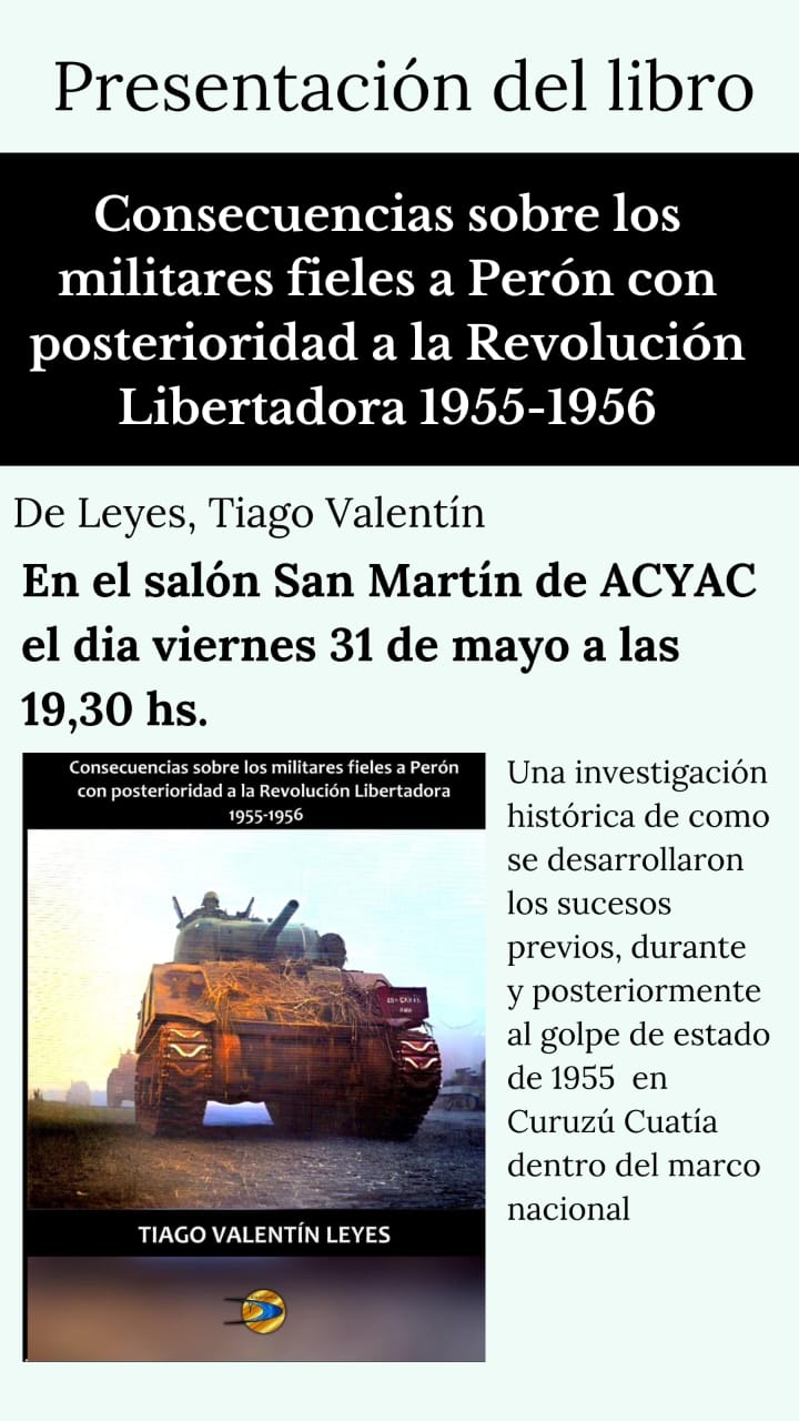Una de las propuestas es la presentación del libro Consecuencias sobre los militares fieles a Perón con posterioridad a la Revolución Libertadora 1955-1956 de Tiago Valentín Leyes, a cargo de Gustavo Adolfo Ojeda periodista de nuestro diario, a las 19.30 en el salón San Martín de Acyac.
