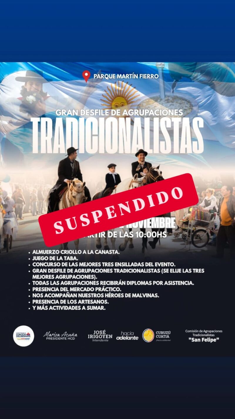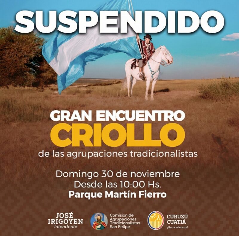 La tradicional celebración como parte del mes aniversario y la agenda cultural de Curuzú Cuatiá se vio obligada a tomar una pausa. Debido a las inclemencias climáticas que afectan a la región, el municipio tomó la decisión de suspender el esperado Gran Encuentro Criollo que estaba programado para la jornada de hoy, domingo 30 de noviembre.