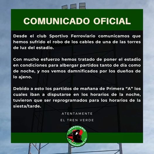 “Desde el Club Sportivo Ferroviario comunicamos que hemos sufrido el robo de los cables de una de las torres de luz del estadio”, informaron a través de sus redes sociales.