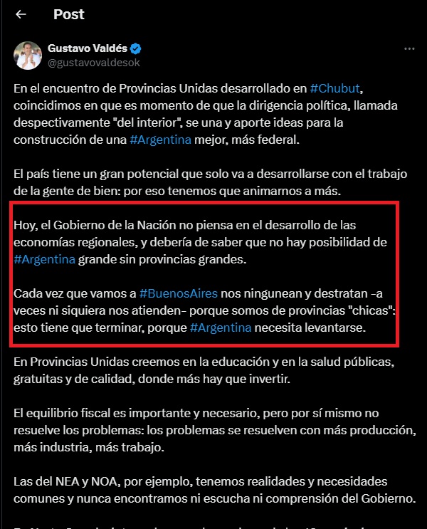 Horas después del acto principal de Provincias Unidas en el hotel Rayentray, de Puerto Madryn, Chubut, Gustavo Valdés dejó sus primeras impresiones a través de su cuenta oficial de X.