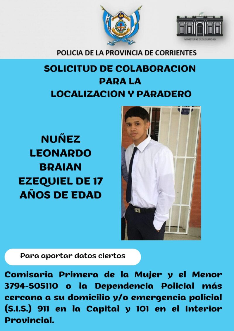 Por otro lado, la Comisaría Primera de la Mujer y el Menor activó la búsqueda de Leonardo Braian Ezequiel Nuñez, de 17 años, quien también fue reportado como desaparecido este sábado 9 de agosto. El joven fue visto por última vez con un pantalón azul, zapatos negros, una campera inflable de color negro y una mochila con líneas naranjas.