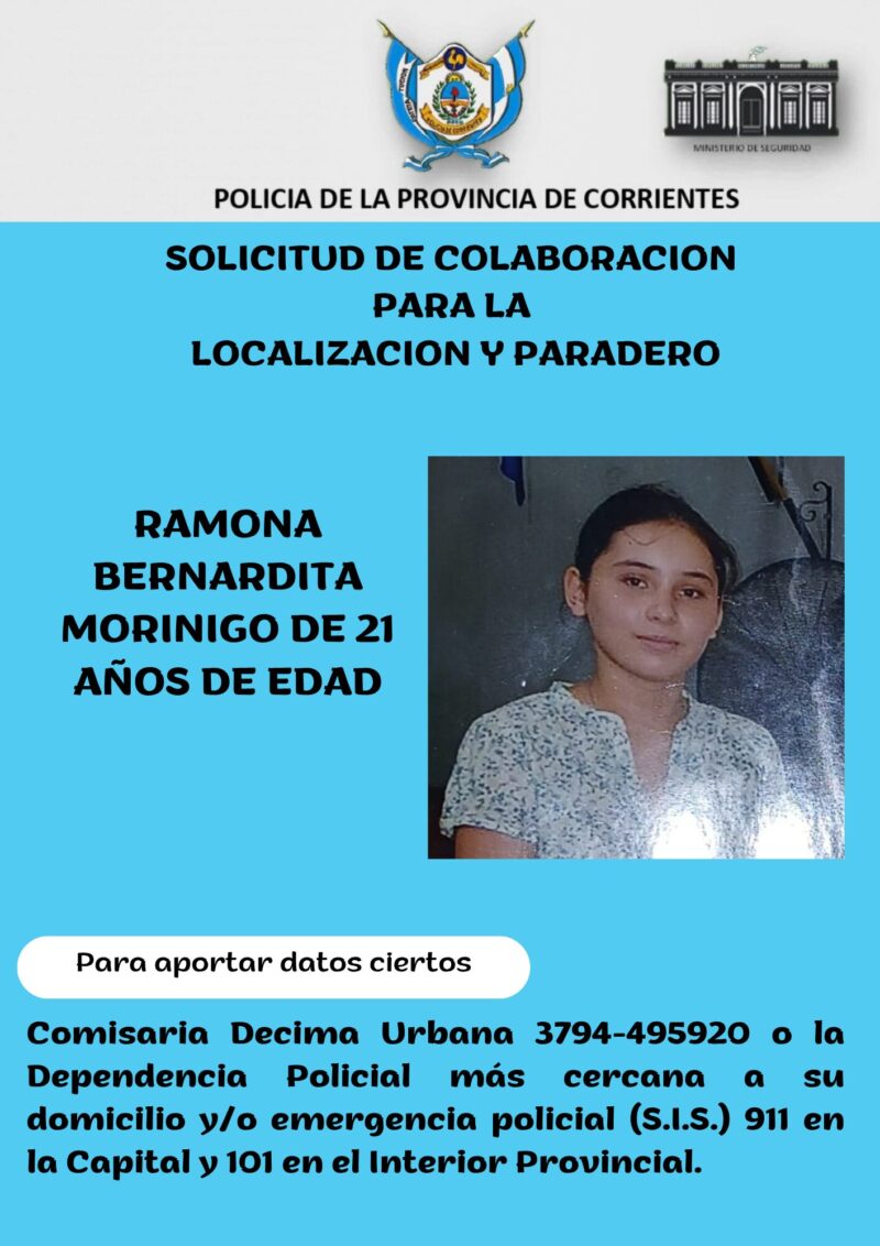 Dos familias de Corrientes viven horas de angustia y desesperación tras la desaparición de dos de sus integrantes en las últimas horas. La Policía de Corrientes, a través de las comisarías Décima y Primera de la Mujer y el Menor, emitió sendos pedidos para colaborar en la búsqueda de Ramona Bernardita Morinigo, de 21 años, y Leonardo Braian Ezequiel Núñez, de 17.