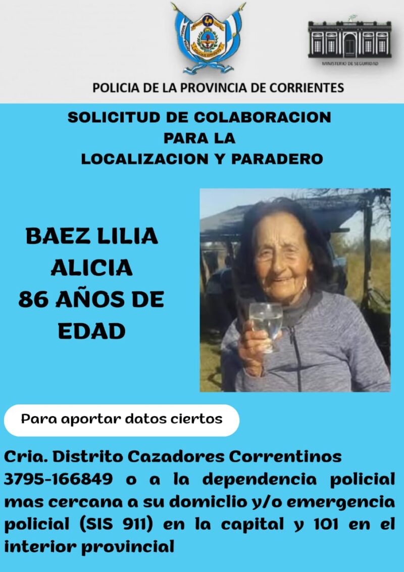 La Policía de Corrientes emitió un pedido de colaboración urgente a la comunidad para localizar a Lilia Alicia Báez, una mujer de 86 años que se encuentra desaparecida desde la mañana de este domingo. La denuncia fue radicada por un familiar de apellido Báez en la Comisaría de Cazadores Correntinos, activando de inmediato el protocolo de búsqueda de personas.