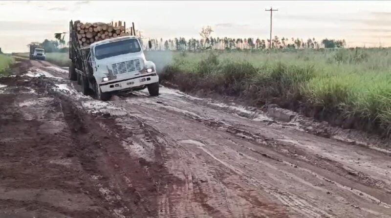 Una situación de proporciones dantescas se observó sobre la Ruta Provincial N° 37. Un convoy de camiones salió después de un día de lluvia torrencial. Las imágenes muestran en crudo cómo afecta el traslado descontrolado de -en este caso- postes de madera y troncos en pleno lodazal.